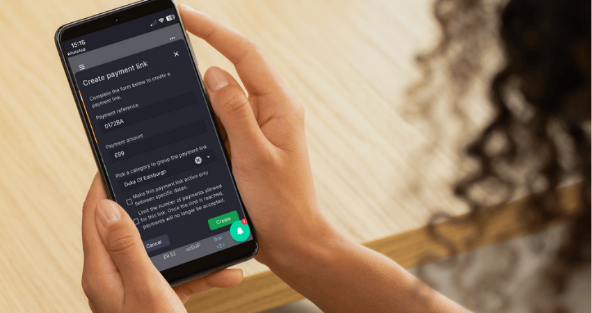 Enter amount, description and reference, then generate a secure link. Add optional fields to capture the details you need in the same flow.